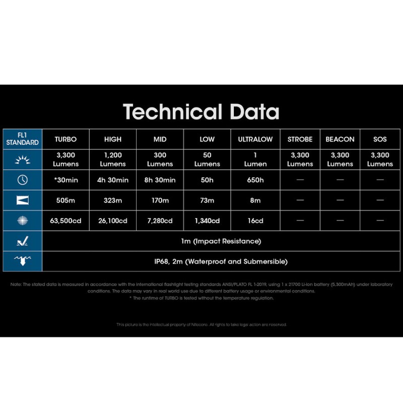 C’est un concentré de puissance grâce à sa LED Nitecore UHI, elle développe une puissance de 3300 Lumens pour une autonomie de 30min avec une batterie Nitecore 21700 5300mAh et une portée de 505 mètres.