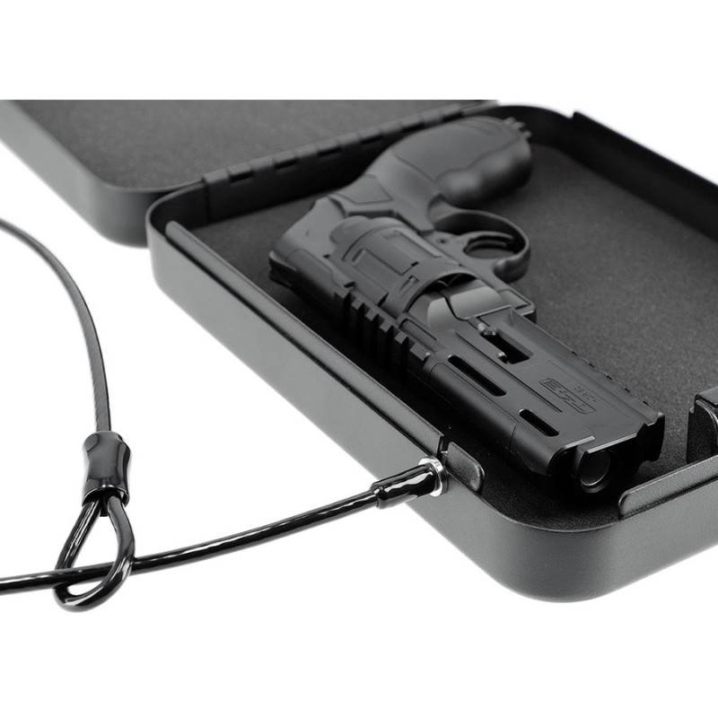 | Le "Coffre-fort L" est parfait pour un stockage sûr et sécurisé des armes de poing ou d'autres objets de valeur. Son boîtier en acier de 1,3 mm d'épaisseur offre une très grande résistance à toute tentative d'effraction. Quoique compact, il permet le rangement d'armes de poing petites ou grandes, comme par exemple un HDR 50 ou un Smith & Wesson 629 avec un canon de 6,5 pouces. Il est livré avec un câble en acier ultra résistant et détachable, permettant de le sécuriser à des objets fixes. Le rembourrage interne en mousse évite les rayures sur les objets stockés. Il se verrouille à l'aide d'une serrure à combinaison. Sa qualité de fabrication lui a valu la certification par le Département de la Justice de Californie. |