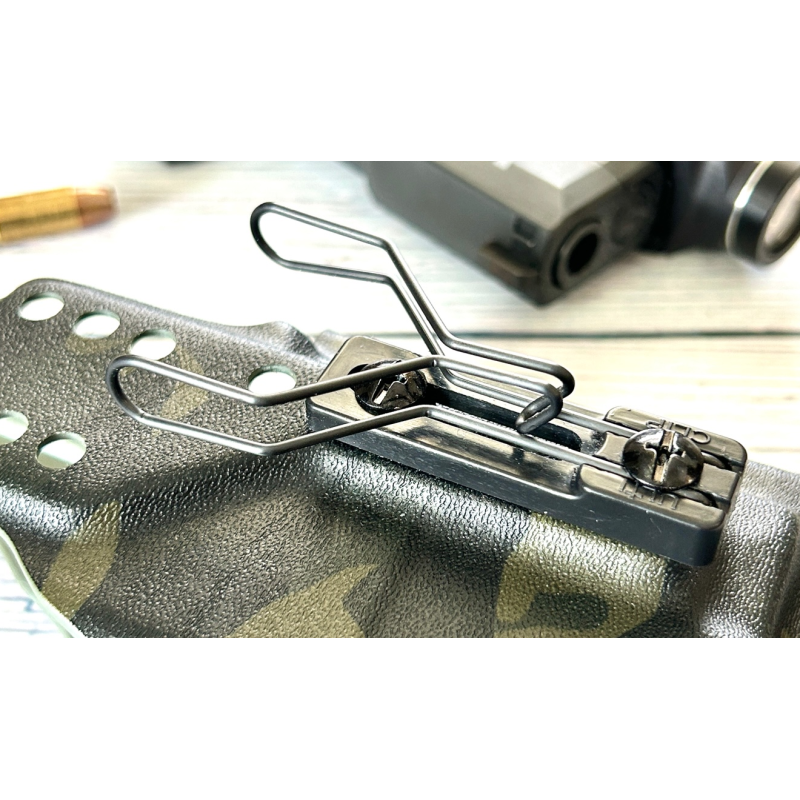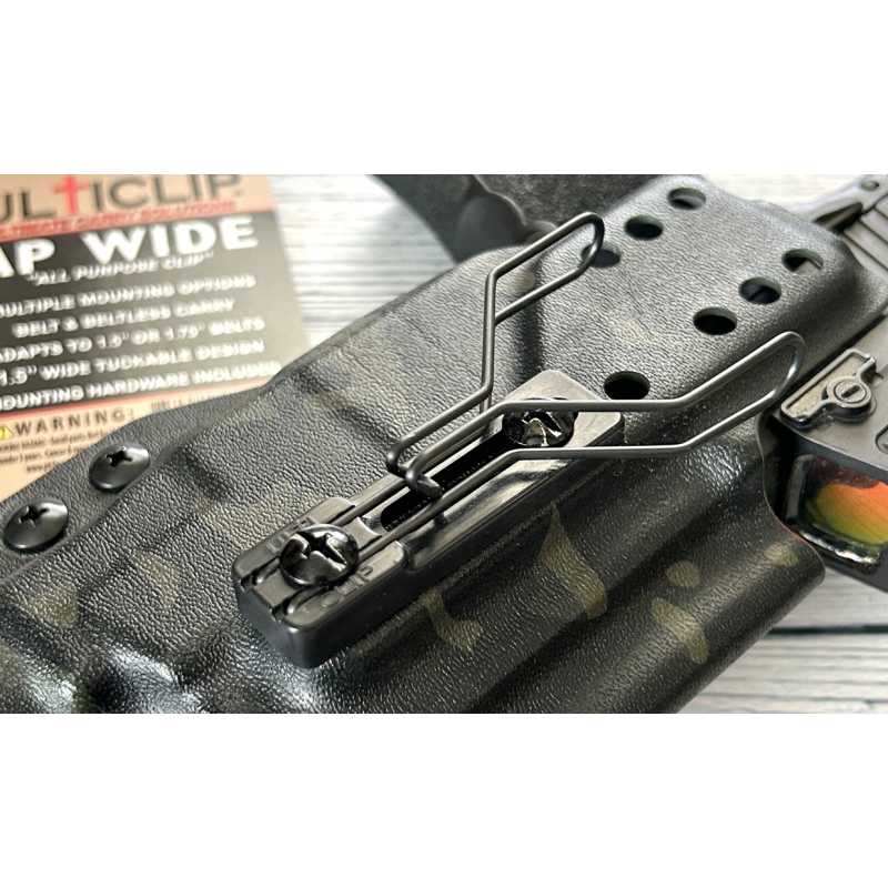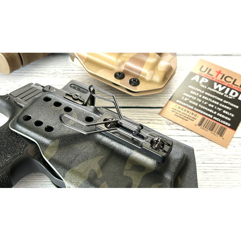 Le clip large AP (All Purpose Wide Clip) offre une variété d'options de fixation pour les étuis et autres équipements. Le design large crée une stabilité supplémentaire en répartissant le poids de votre équipement sur une zone plus large de la ceinture, du ceinturon, etc. L'AP Wide offre une rétention exceptionnelle lorsqu'il est utilisé avec une ceinture de 1,5″ ou 1,75″. Lorsqu'il est utilisé avec l'adaptateur de ceinture inclus, l'AP Wide offre une rétention modérée sans ceinture. De par sa conception, l'AP Wide Clip est à la fois rentrable et discret, ce qui permet un maximum de confort et de dissimulation. L'AP Wide Clip est en instance de brevet et est fièrement fabriqué aux Etats-Unis.