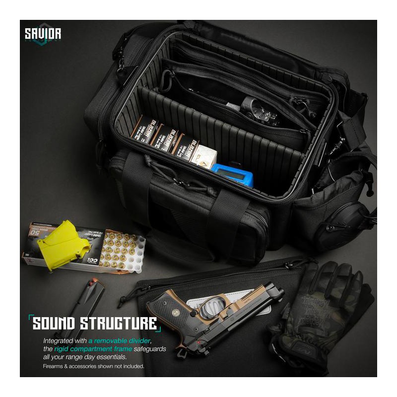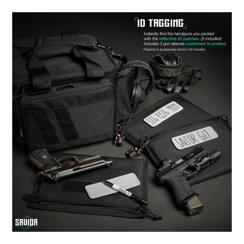 Comprend 3 pochettes pour arme de poing.