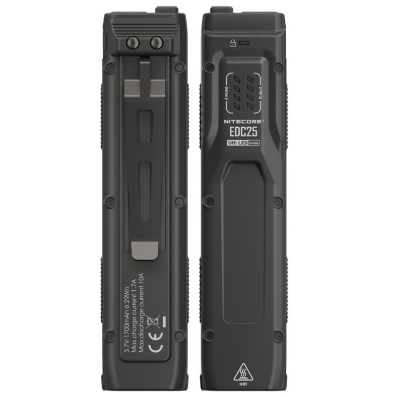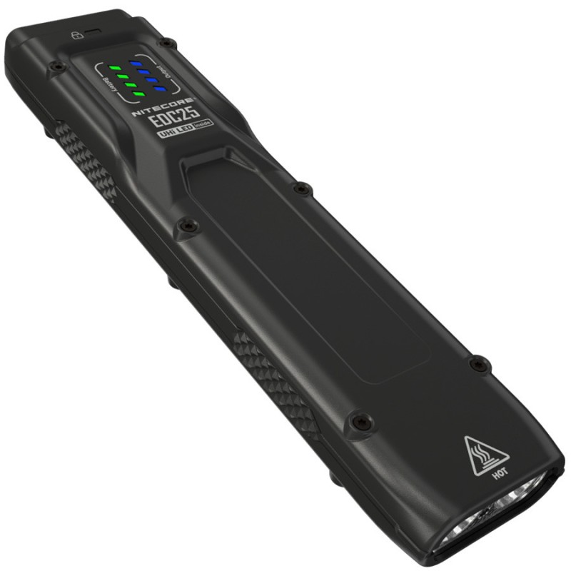 Pour un transport sûr évitant toute activation accidentelle qui pourrait consommer la batterie de la lampe, la EDC25 est conçue avec une fonction verrouillage sur 2 modes : full (aucun bouton n'est accessible) ou semi (seul le bouton personnalisé est disponible). Pour plus de portabilité, la lampe s'équipe d'un clip en acier inoxydable qui peut accueillir la dragonne incluse ou une dragonne de votre choix. Pratique, la EDC25 est équipée de voyants lumineux vert et permettant de suivre en temps réel l'autonomie, l'état de la batterie, les modes etc. Sa fonction mémoire est également utile puisqu'elle vous permet de disposer du dernier mode utilisé lorsque vousréactivez la lampe.