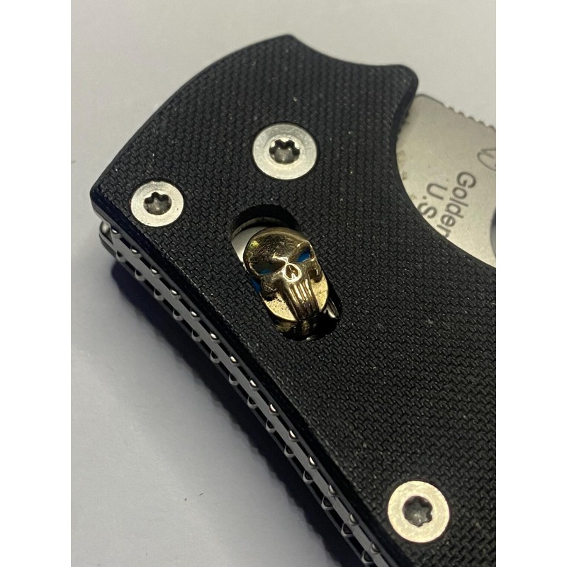 Ornez votre couteau de 2 superbes têtes de PUNISHER de part et d'autre de votre couteau. Elles peuvent etre en argent, bronze black oxide, laiton ou polymère noir dans lesquelles vous pourrez insérer des tubes en tritium de 2x6mm (non fournis*) que vous pouvez changer au grès de vos envies de couleurs. Se chargeant de lumière UV les yeux de la tete de mort se verront dans le noir tel le Punisher !