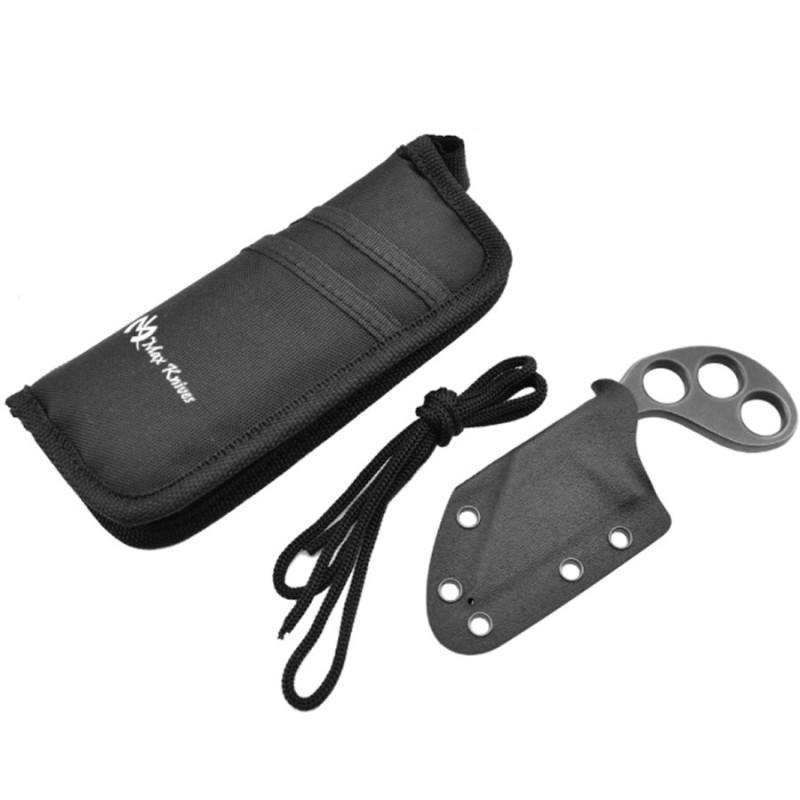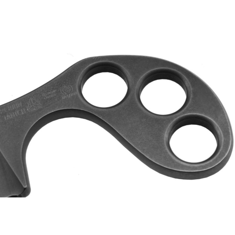 Couteau ultra ergonomique, monobloc, facile à transporter, peut être pris en main de différentes manières. Le manche comprend des trous pour ajouter une paracorde (incluse).