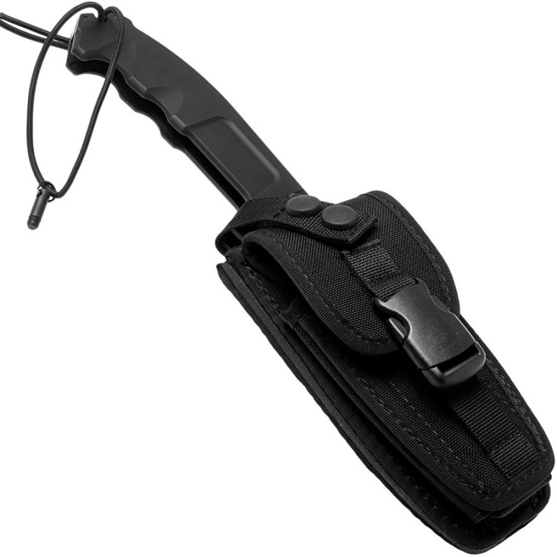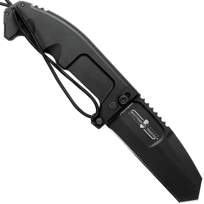 Son système de verrouillage très fiable, est doté d'un dispositif de sécurité supplémentaire, qui transforme efficacement ce pliant en un couteau à lame fixe. L'ouverture et la fermeture se font à deux mains afin de minimiser les risques de blessures auto-infligées, car la lame, en raison de son poids, est une véritable guillotine.