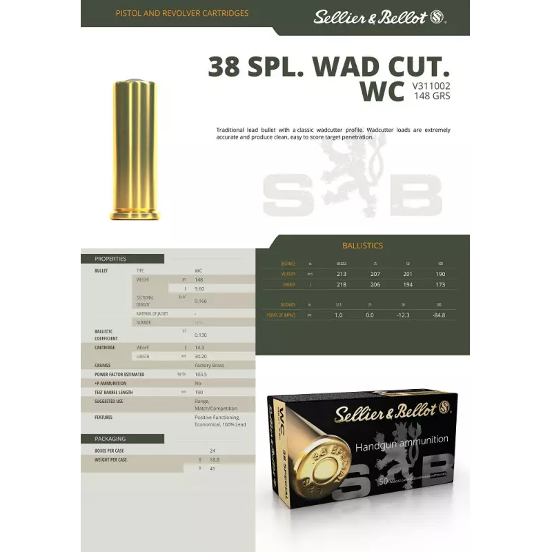 Cartouches .38 SPECIAL WAD CUTTER 148 GRS x50 - Sellier & Bellot