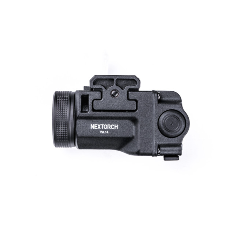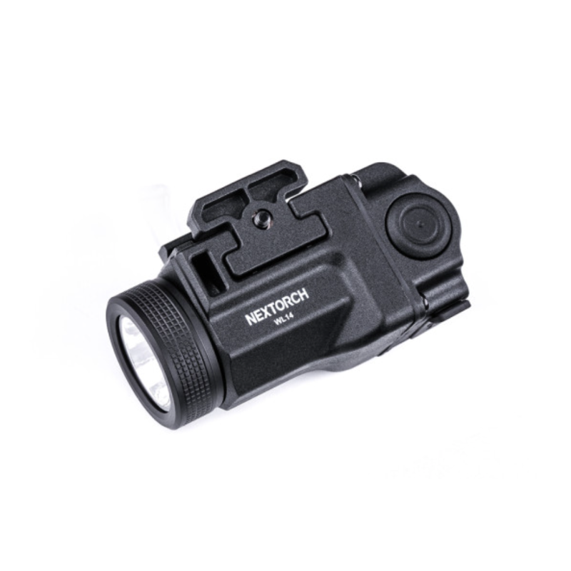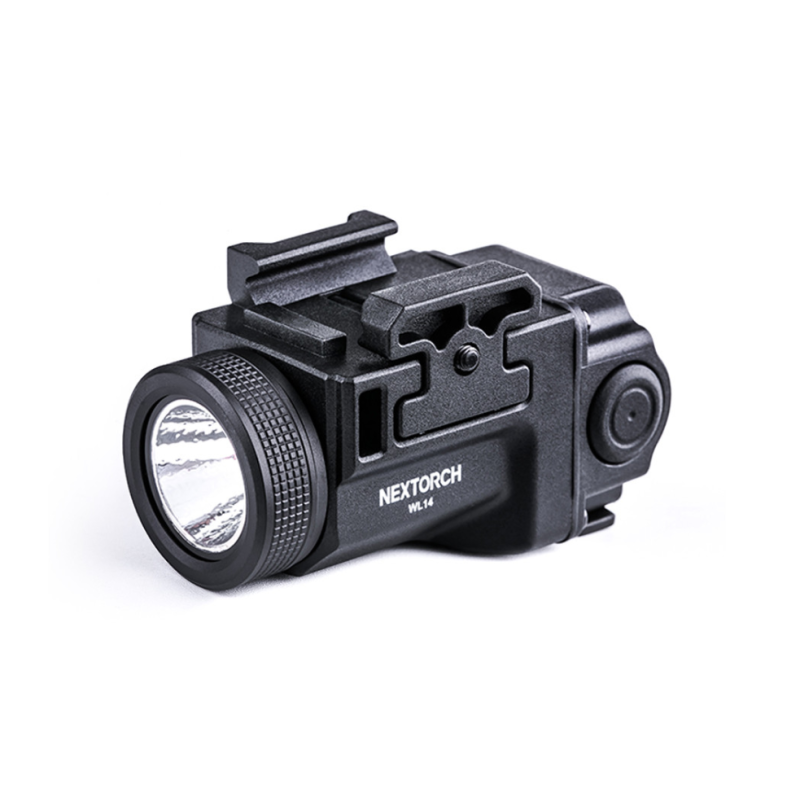 La lampe WL14 est une lampe tactique robuste et simple d'utilisation destinée à être montée sur une arme de poing grâce à sa fixation pour rail picatinny. Sa batterie interne se recharge grâce à sa prise USB-C intégrée. La lampe possède deux interrupteurs identiques situés à gauche et à droite pour accéder facilement et rapidement aux différents modes.