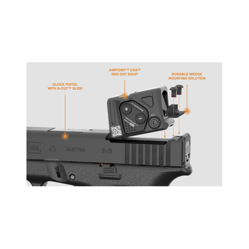 Combiné à L'AIMPOINT COA, développé et conçu en mettant l'accent sur l'expérience de tir, associe facilité d'utilisation, fiabilité, performance et innovation dans un design ultra-compact. Son design épuré, son faible poids et ses dimensions compactes font de l’optique COA l’idéal. Compact et robuste, L'AIMPOINT COA offre aux tireurs une expérience de tir exceptionnelle avec une norme de montage révolutionnaire : l’A-CUT d’Aimpoint, sa découpe directe stabilise le viseur dans toutes les directions et offre un profil extrêmement bas, le viseur étant monté profondément dans la glissière.