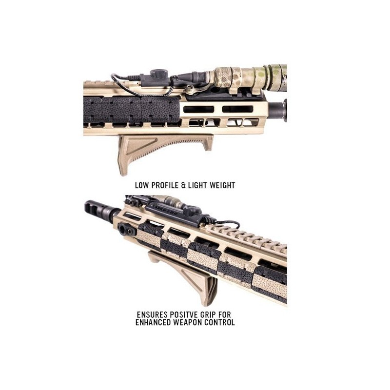 Cette poignée M-LOK® AFG (Angled Fore Grip) intègre le système de fixation directe M-LOK® ce qui permet d'être plus compact que ses prédécesseurs. L'AFG prend en compte la position naturelle des mains et offre plus de confort et d'ergonomie au tireur. L'angle réduit la fatigue des bras et permet de mieux tenir son arme, induisant davantage de précision dans le tir. Le recul étant mieux compensé, vous gagnez donc en stabilité lors des tirs.