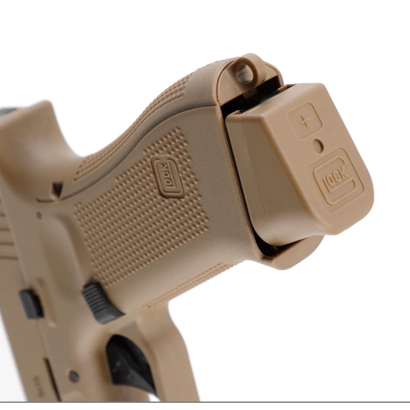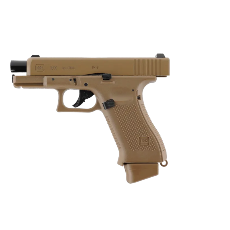 Le Glock 19X est une réplique airsoft sous licence, alimentée au CO2. Il associe la carcasse pleine-taille du Glock 17 à la culasse compacte du Glock 19, dans une finition couleur coyote qui le distingue. Sa culasse métallique lourde et son système CO2 avec blowback restituent un recul convaincant et un comportement proche de l'original.