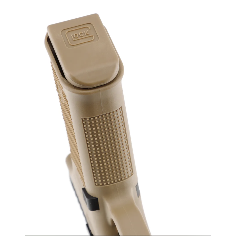 Le Glock 17 Gen5 en finition Coyote se distingue par son contraste saisissant entre sa carcasse coyote en polymère et sa culasse noire. Son design moderne et ses commandes sombres en font une pièce remarquable sur tout terrain d'airsoft.