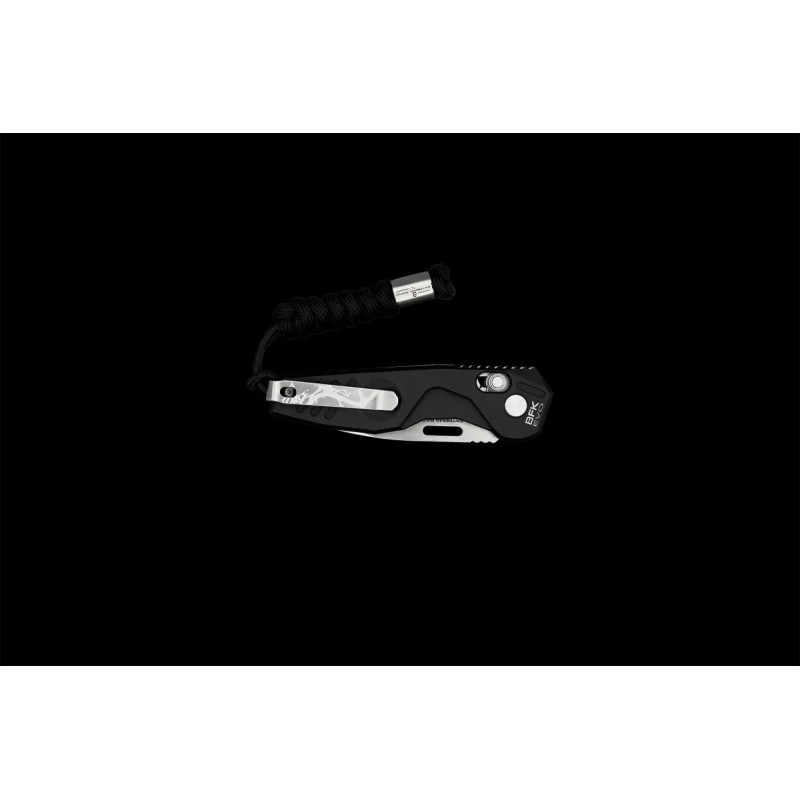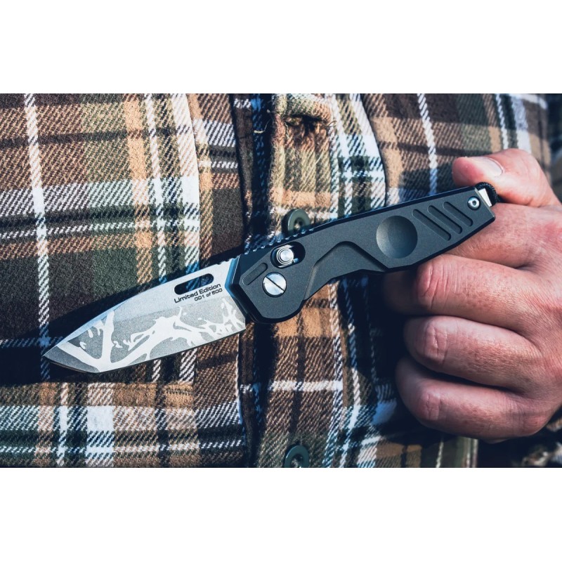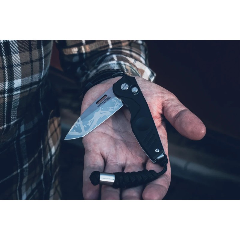 Des gravures laser dédiées sur la lame et le clip confèrent au couteau une forte identité et confirment son appartenance à la série.