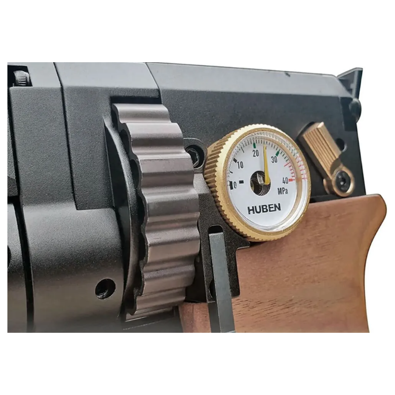 Au cœur du Huben GK1 V3 se trouvent un canon de 210 mm et un cylindre PCP de 85 cm3. La surveillance de la pression d'air est facile grâce au manomètre intégré, ce qui favorise des performances optimales. Le remplissage du cylindre est très simple grâce à l'adaptateur de remplissage fourni, situé sur le côté gauche.