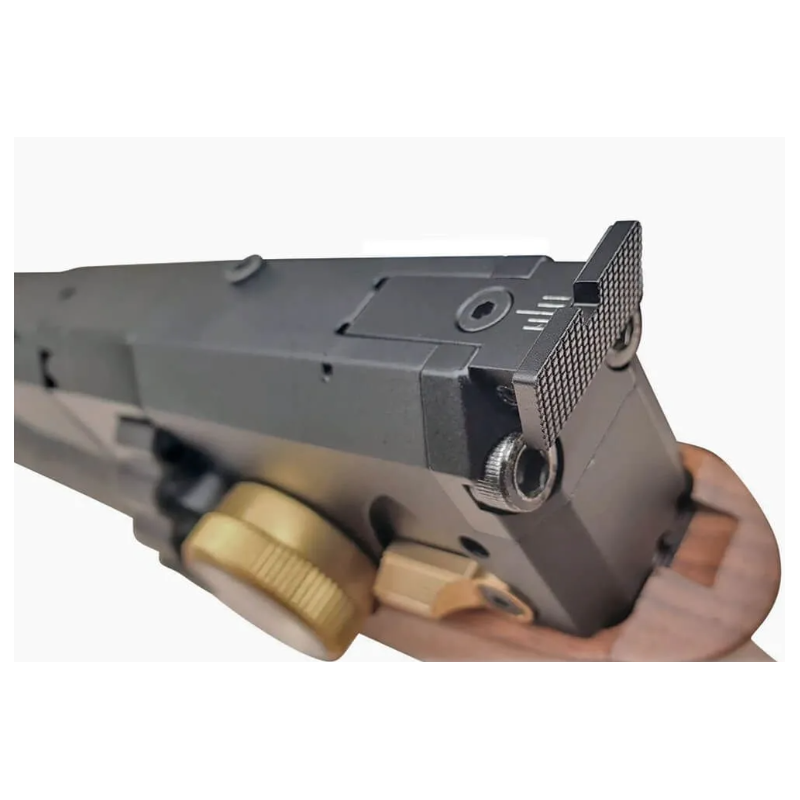 Le réglage précis de la puissance du pistolet est intuitif, grâce au mécanisme réglable accessible à l'aide d'une clé Allen. Pour améliorer la précision, le rail de lunette Dovetail de 11 mm situé au-dessus du cache-canon permet d'installer un viseur à point rouge ou d'utiliser les viseurs ouverts réglables pour une visée précise.