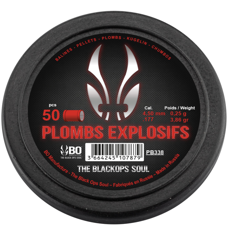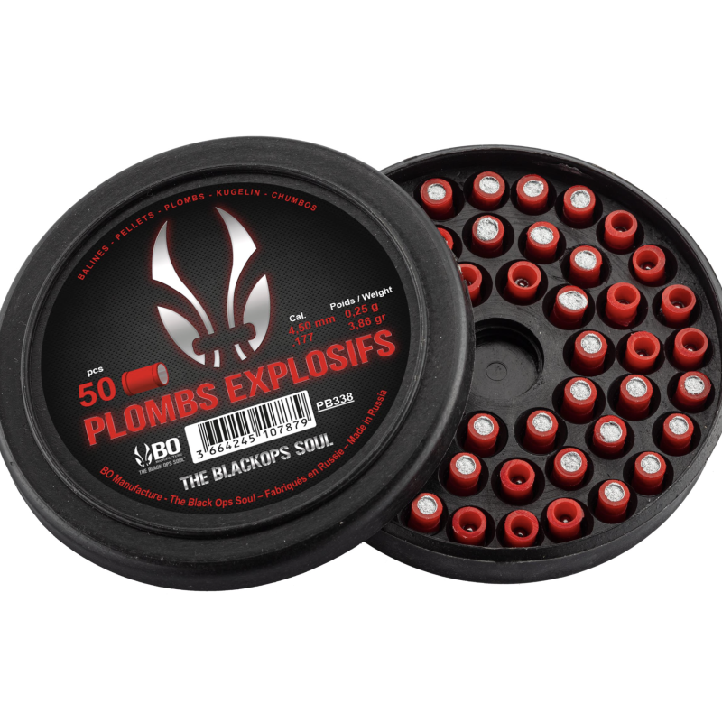 Plomb explosif BO Manufacture Black Ops Soul à tête plate, de couleur rouge. Occasionne une déflagration à l'impact, tel un pétard de type "claque doigt".