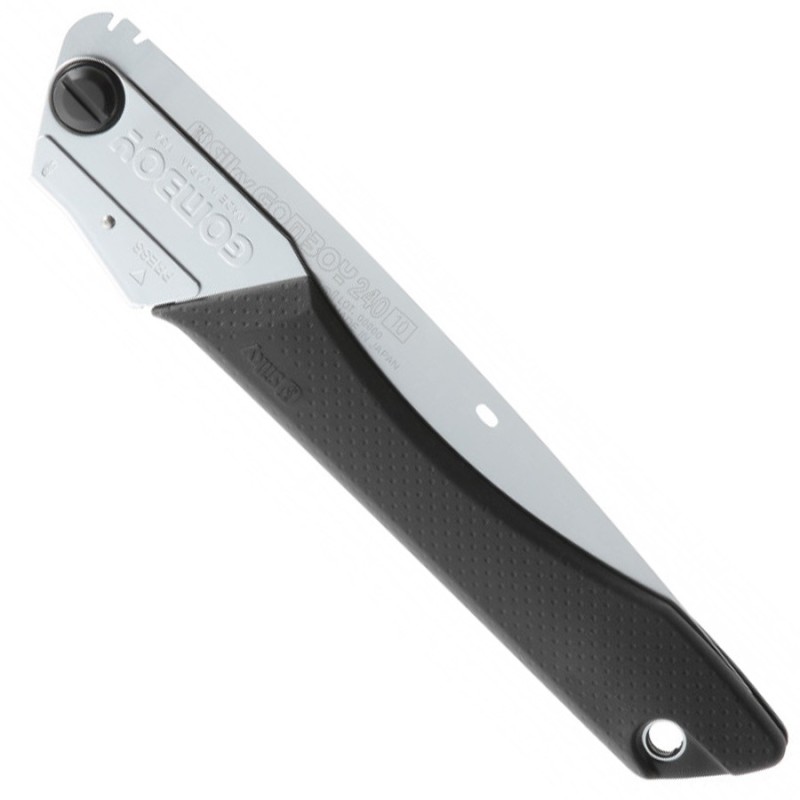 La poignée en caoutchouc de la Gomboy assure une bonne prise en main confortable. Le trou de la poignée permet de passer un mousqueton ou corde à la scie.